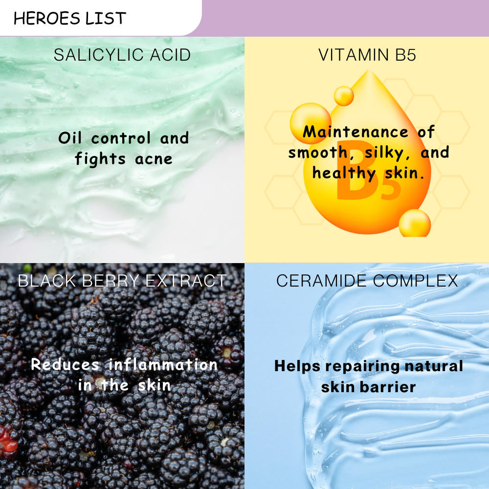 It contains 2% salicylic acid, vitamin B5, and ceramides. These ingredients work together to gently cleanse and exfoliate the skin, leaving it clear and nourished. Ideal for those with acne-prone or oily skin, it helps to prevent breakouts and improve overall skin texture.